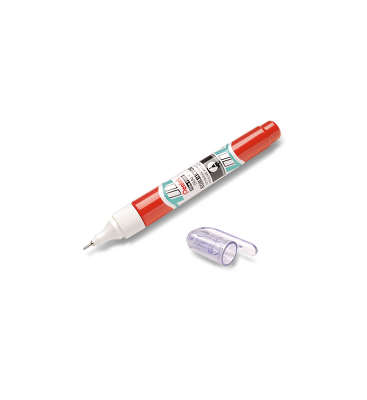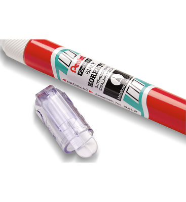 Klasyczny korektor. Cienka, okrągła końcówka do precyzyjnego tuszowania najmniejszych błędów. Końcówka zaworkowa przepuszcza dokładnie wymierzoną ilość płynu i się nie zaciera (w przeciwieństwie do modeli z popularną końcówką kulkową). Szybkoschnący korygujący tusz na bazie oleju gwarantuje gładkie i błyskawiczne pisanie już w chwilę po użyciu korektora. Pojemność wynosi 7 ml. Obudowa w czerwonym kolorze. Nasadka z wygodnym klipem zabezpiecza przed wysychaniem. Może być stosowany jako biały marker, do dekorowania. Doskonały do codziennego użytku w domu, szkole, w biurze i pracowni.