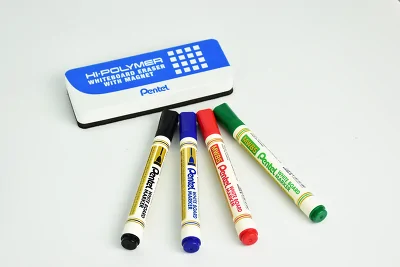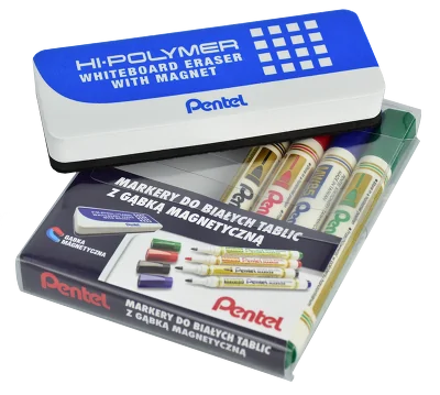 Komplet 4 ekonomicznych markerów do białych i ceramicznych tablic. Tusz jest łatwo usuwalny z powierzchni tablicy, nie pozostawia na niej trwałych śladów. Niezbędny do pracy w każdym biurze, pracowni i na uczelni. W zestawie znajduje się również gąbka magnetyczna, która z łatwością przylega do powierzchni tablicy, dzięki czemu zawsze masz ją pod ręką. Gąbka skutecznie usuwa ślady po markerach nie pozostawiając smug i zarysowań.